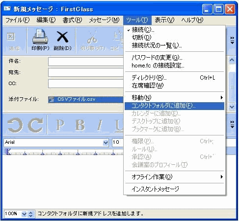 メッセージに添付された.csvファイルをインポートするには、そのファイルを選択して、[ツール]>[コンタクトに追加]を選択します。コンタクトが[コンタクト]フォルダ内に作成されます。