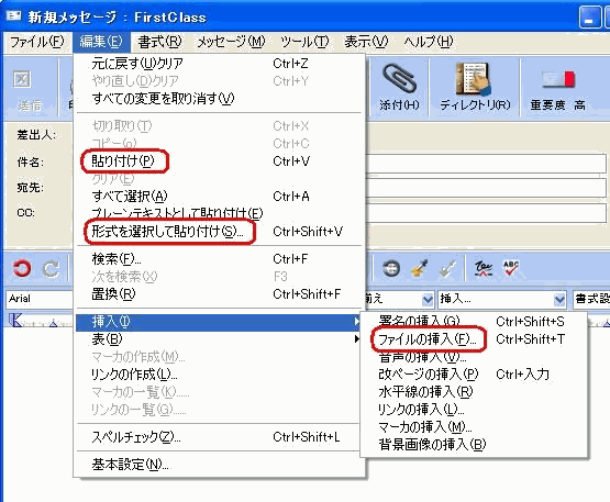 • 画像をクリップボードにコピーし、[編集]>[貼り付け]または[形式を選択して貼り付け]を選択する
