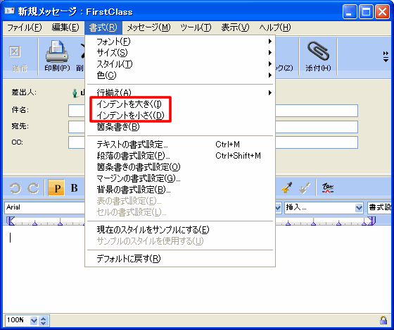 •     [書式]>[インデントを大きく]を選択して次のタブ位置にインデントを設定するか、[書式]>[インデントを小さく]を選択してインデントを直前のタブ位置まで戻す