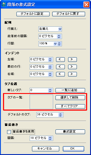 削除したタブ位置の左側にあるデフォルトのタブ位置がすべて復元されます。