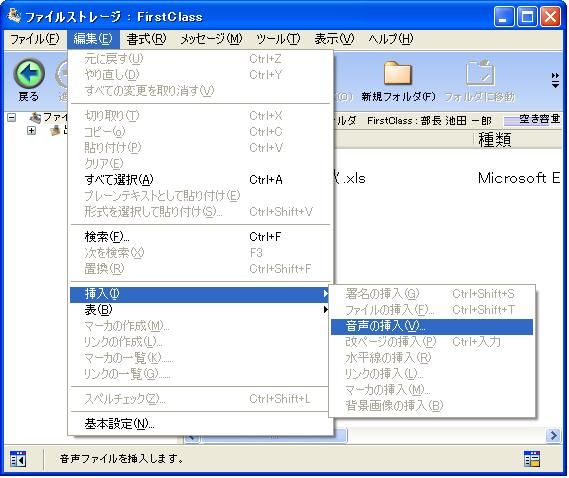 [編集]>[挿入]>[音声の挿入]を選択します。