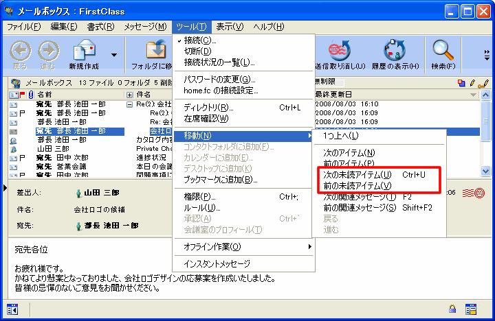 [ツール]>[移動]>[次の未読アイテム]を選択します。
