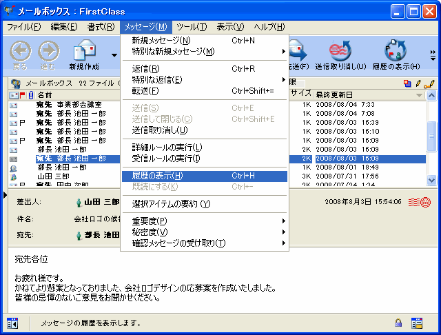 FirstClassでは、各メッセージの履歴が記録されます。履歴には、メッセージの作成日時、メッセージを読んだユーザとその日時、メッセージに対して行われたその他の操作内容(転送やコピーなど)などが記録されます。