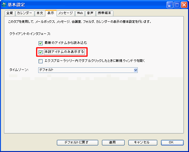 デフォルトで未読メッセージだけを一覧表示するには、基本設定]の[表示]タブで[未読アイテムのみ表示する]を選択してください。