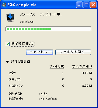 アップロードとダウンロード(ファイル転送)は、バックグラウンドで実行されます。実行中は、追加のファイル転送を開始するなど、他のタスクを実行できます。ファイル転送の実行中には[ファイルの転送]フォームが表示され、ファイル転送の進行状況が示されます。転送が完了したら、[フォルダを開く]をクリックして、転送したファイルが含まれるコンテナを開くことができます。ファイル転送_完了時にこのフォームが自動的に閉じられるようにするには、フォームを閉じる前に[終了時に閉じる]を選択してください。