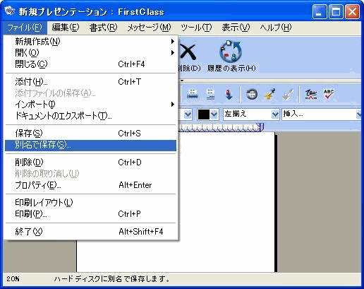 プレゼンテーションをFirstClassの他のコンテナに保存するには、[ファイル]>[別名で保存]を選択してください。こうすると、名前と場所が指定できるようになります。