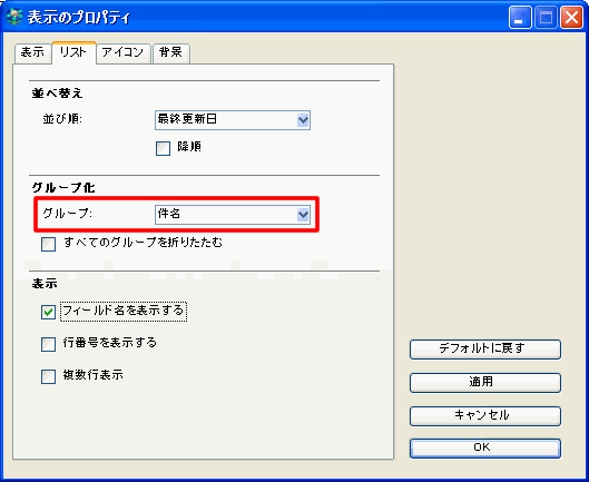 また、グループ化する列を指定するのに、表示のプロパティの[グループ]で列を選択する方法もあります。