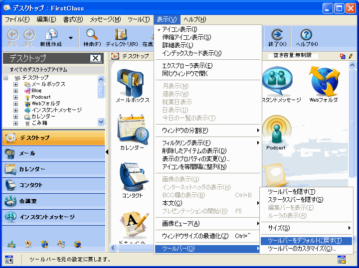 FirstClassのコンテナには、種類ごとに独自のツールバーがあります。ツールバーボタンは、よく使うコマンドへのショートカットとして機能します。このボタンは、メニューからコマンドを選択する代わりに使用できます。