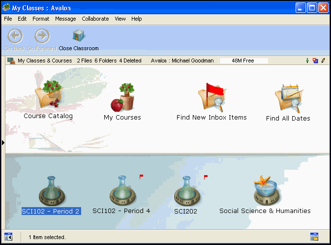 From here, the teacher can manage his classes (including adding a new classroom from the course catalog or closing a classroom) as well as any courses he is developing, or perform a search for specific information such as new assignments that have been submitted. From here, the student can access any of his classes, journals, or project areas, or perform a search for specific information such as new assignments that need to be completed.