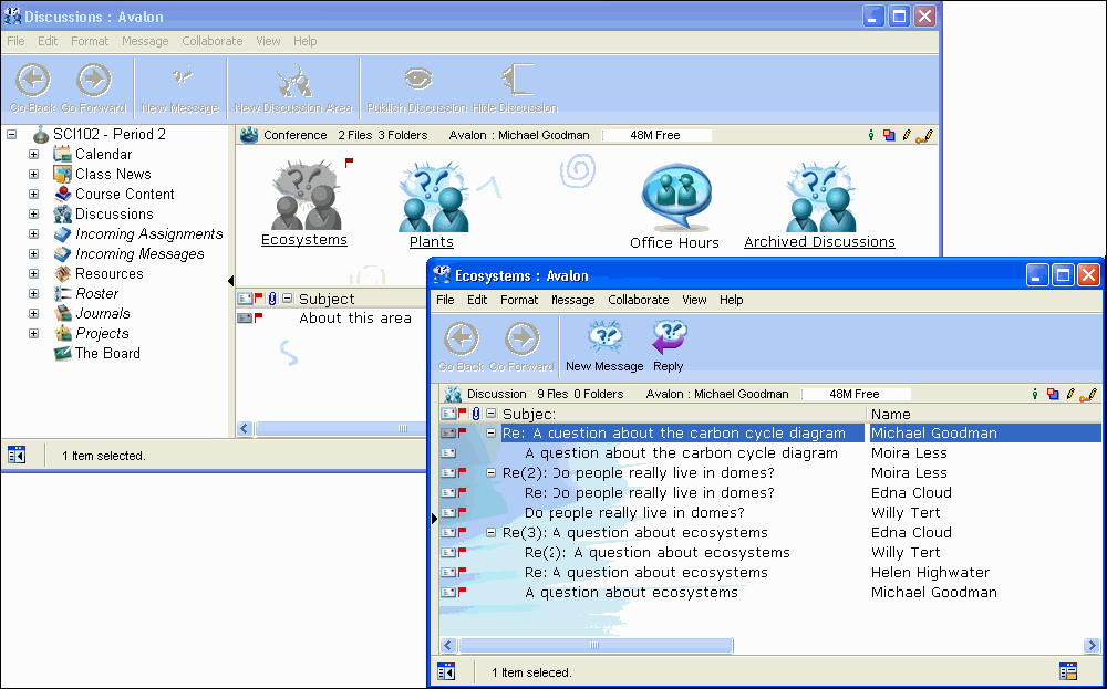 The Discussions area is a container where students can communicate with each other and collaborate on work, and where the teacher can post information and questions for discussion. The teacher can create multiple discussion areas for various topics, as well as create online chat rooms and save the transcripts.