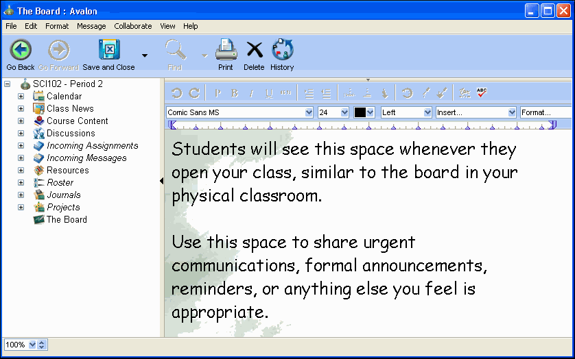 This is the teacher and students' initial view of the class, similar to the chalkboard or whiteboard that students see when they enter their physical classroom. The teacher should use this area to post urgent messages, formal announcements, reminders, or anything else the teacher feels is appropriate.