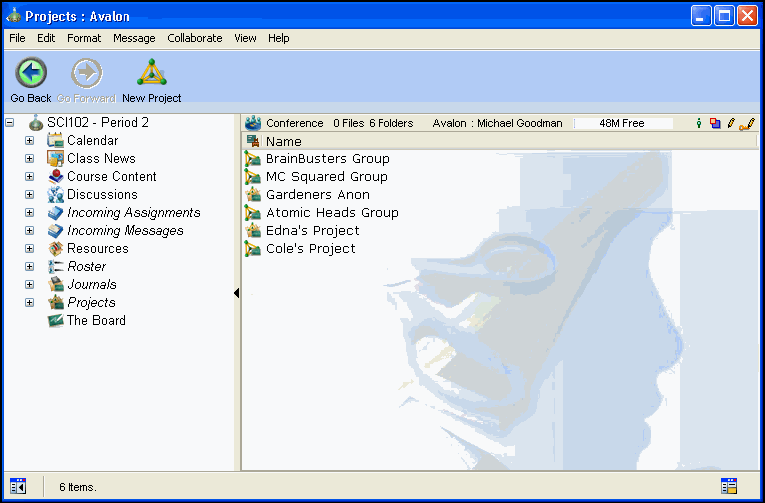 In addition to the public area of the class, the teacher has additional areas that are private to her own view: an Incoming Assignments area, Incoming Messages area, Roster, Projects area and Journals area. Also, unpublished assignments and lessons can be maintained in the Course Content area. These lessons and assignments are not visible to students until the teacher publishes them.