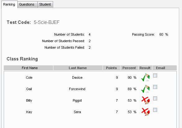 Use the Reporting tool to generate a comprehensive report for the entire class or for individual students. You can create summaries of all correct or incorrect answers, rankings, and other test statistics, and you have the option of emailing the report out.