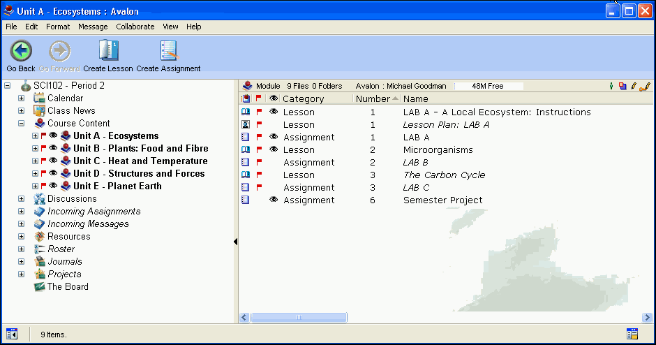 In this example, the course is Grade 7 Science. Course Content includes five modules, all of which are visible to students. The Unit A - Ecosystems module has been populated with three lessons, one semester project, and three labs. LAB A has three components: the instructions (lesson), the lab assignment that will be completed (assignment), and the teacher's lesson plan, which will not be published.