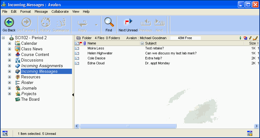 In a FirstClass ED environment, students can simply enter your online classroom and send you a message. These messages are stored in your Incoming Messages area.