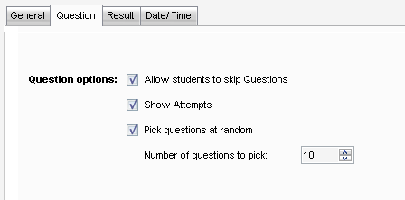 • Select the number of questions that will be on the test (Number of questions to pick). Questions will be displayed in order unless "Pick questions at random" is selected.
