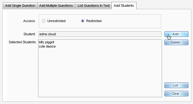 Use the Add Students tab to limit access to the test to specific students.