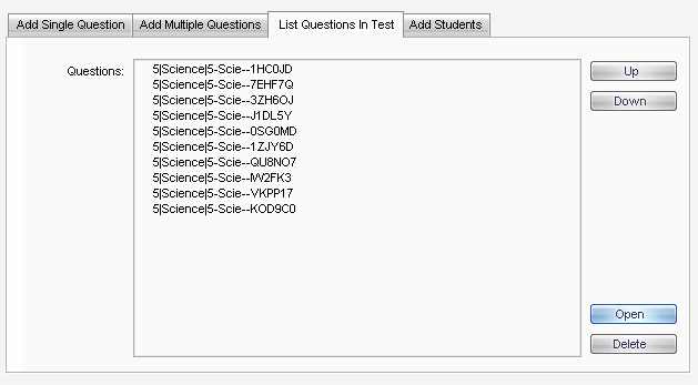 Use the List Questions in Test tab to view the order of the questions you have selected. Use the Up and Down buttons to rearrange the questions if desired.