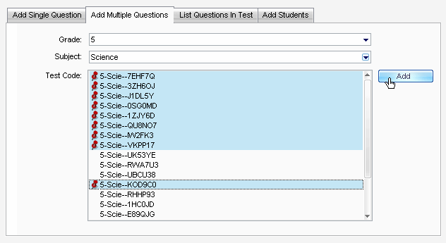 On the Add Single Question tab, select the Grade, Subject, and Question Code of the question you wish to add, and then click Add.