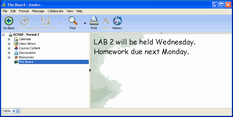 This is where the teacher may post urgent communications, reminders, and so on. You will see The Board each time you enter the class.