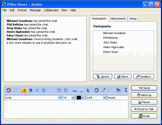 A chat room is an ideal forum for you to ask questions of the teacher and get extra help. Your teacher may set "chat hours" so you can go online at that time and ask questions. Further, your teacher may use the class chat room to host simulations and role-playing events, or present transcript-based assignments.