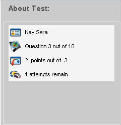 The About this test area on the right side of the screen lists test details you need to know. The information you see may be different from this view depending on the criteria your teacher has set for your test.
