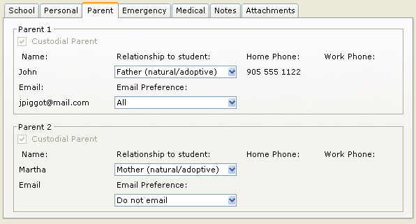 Throughout the year, you may want to contact parents about a low mark on a test, an incomplete assignment, or showcase their child's work. You can use the Parent tab of the student information form to obtain parents' email addresses.