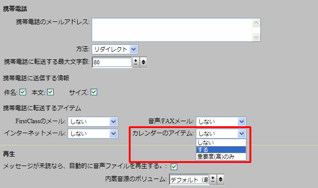 リマインダを携帯電話に転送するには、[基本設定]の[携帯電話に転送するアイテム]を更新します。[カレンダーのアイテム]で[する]または[重要度(高)のみ]を選択してください。