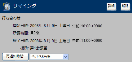 [再通知]の横のフィールドでリマインダの再表示時刻を指定し、[再通知]をクリックします。