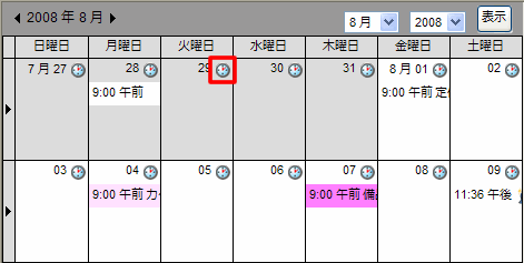 特定の日に始まる予定を作成するには、その日付の横にある[新規予定]のアイコンをクリックしてください。日表示の場合は、予定の開始時刻をクリックしてください。