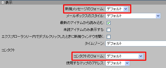 [基本設定]の[表示]タブで、[コンタクト]フォルダに使用するフォーム、および作成するコンタクトデータベースのデフォルトとして使用するフォームを選択してください。特定のコンタクトデータベースに使用するフォームは、そのコンタクトの権限で選択してください。
