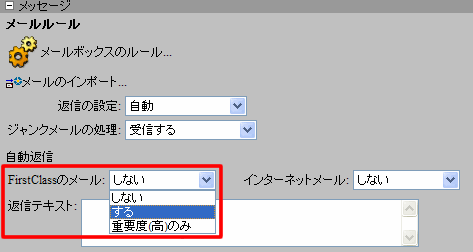 自動返信を有効にするには、[基本設定]の[メッセージ]の[メールルール]で[自動返信]フィールドを更新してください。