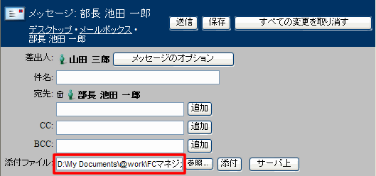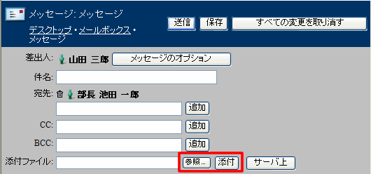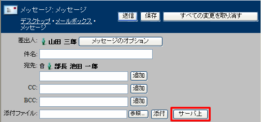 1 [添付ファイル]で[サーバ上]をクリックします。