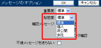 デフォルトでは、メッセージには標準の秘密度が割り当てられます。秘密度を変更するには、[メッセージオプション]フォームの[秘密度]で[個人]、[非公開]、または[会社]を選択してください。