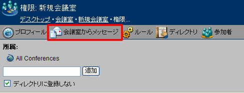メーリングリストには、メッセージだけでなく、ヘルプコマンドや参加者に関する情報の要求などのコマンドを送信できます。これらのコマンドは、会議室の[権限]フォームの[会議室からメッセージ]ボタンを使用して送信する必要があります。