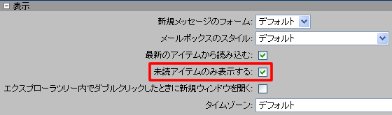 デフォルトで未読メッセージだけを一覧表示するには、基本設定]の[表示]タブで[未読アイテムのみ表示する]を選択してください。