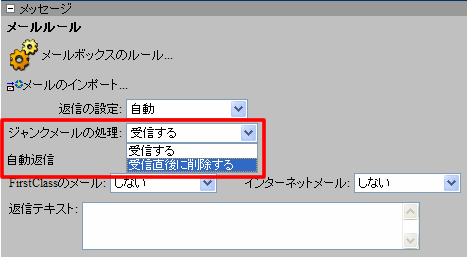 FirstClassがジャンクと判断したメールの処理方法を指定するには、[基本設定]の[メールルール]の[ジャンクメールの処理]で、目的のオプションを選択してください。