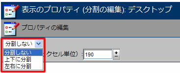 1 [表示のプロパティの変更]をクリックします。 2 [分割の編集]をクリックします。 3 [上下に分割]または[左右に分割]を選択します。 4 [分割のサイズ]で上のペインの高さを指定します。 |
