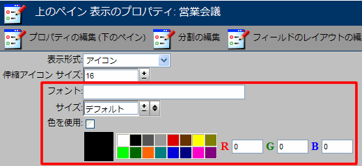 ペインのテキストの表示を変更するには、[表示のプロパティ]フォームで[フォント]、[サイズ]、[色を使用]の各フィールドを更新します。