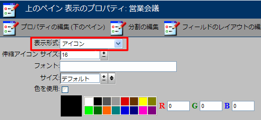 ペインの表示を変更するには、そのペインの[表示のプロパティ]フォームで、[表示形式]フィールドから表示方法を選択します。