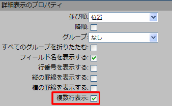 1行に納まらないテキストを途中で切らずに次の行に折り返すには、[表示のプロパティ]フォームの[詳細表示のプロパティ]セクションで[複数行表示]を選択してください。