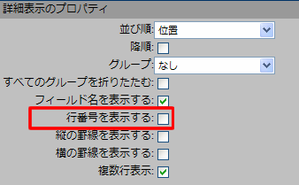 詳細表示で行の左側に行番号を表示するには、[表示のプロパティ]フォームの[詳細表示のプロパティ]セクションで[行番号を表示する]を選択してください。