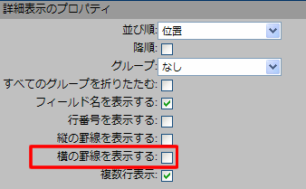 詳細表示で行の境界に横の罫線を表示するには、[表示のプロパティ]フォームの[詳細表示のプロパティ]セクションで[横の罫線を表示する]を選択してください。