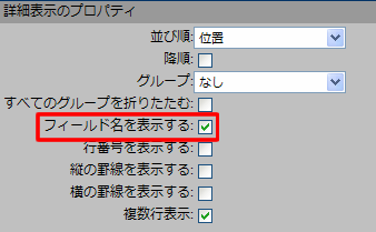 デフォルトでは、詳細表示の各列の先頭には見出しが表示されています。列見出しを表示しないようにするには、そのペイン[表示のプロパティ]フォームにある[フィールド名を表示する]をクリアしてください。