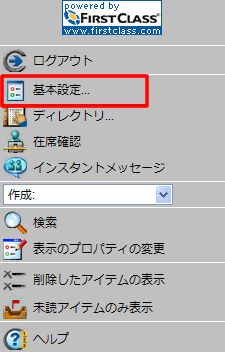 FirstClassのWeb表示の基本設定で設定した内容によって、メインのツールバーがページの上と横のどちらに表示されるか、またテキスト付きで表示されるかどうかが決まります。