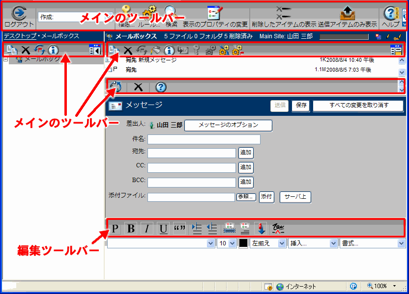 通常、編集可能なメッセージまたはドキュメントが開かれると、編集ツールバーが表示されます。編集ツールバーは以下のパーツで構成されています。